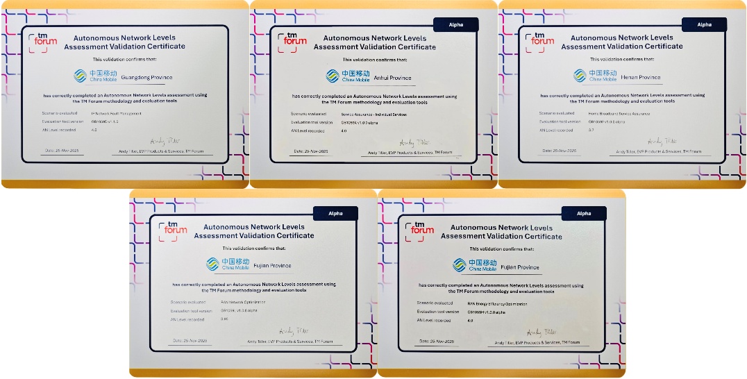 测评结果显示,中国移动在5项高价值运营场景中位居全球第一,硬核实力获国际权威认可。其中,个人业务保障、无线网络节能、IP网络故障管理3大场景获得最高L4级认证 —— 具备“感知-分析-决策-执行”全流程自闭环能力,实现端到端全自动无人干预,提质降本增效成效亮眼;无线网络优化场景达L3.95级,家宽业务保障场景达L3.7级,均逼近端到端全自动水平,大幅降低人工运维成本。这一成绩不仅印证了中国移动自智网络技术的成熟度与商用落地能力,更奠定了其在全球通信网络数智化转型领域的领先地位。