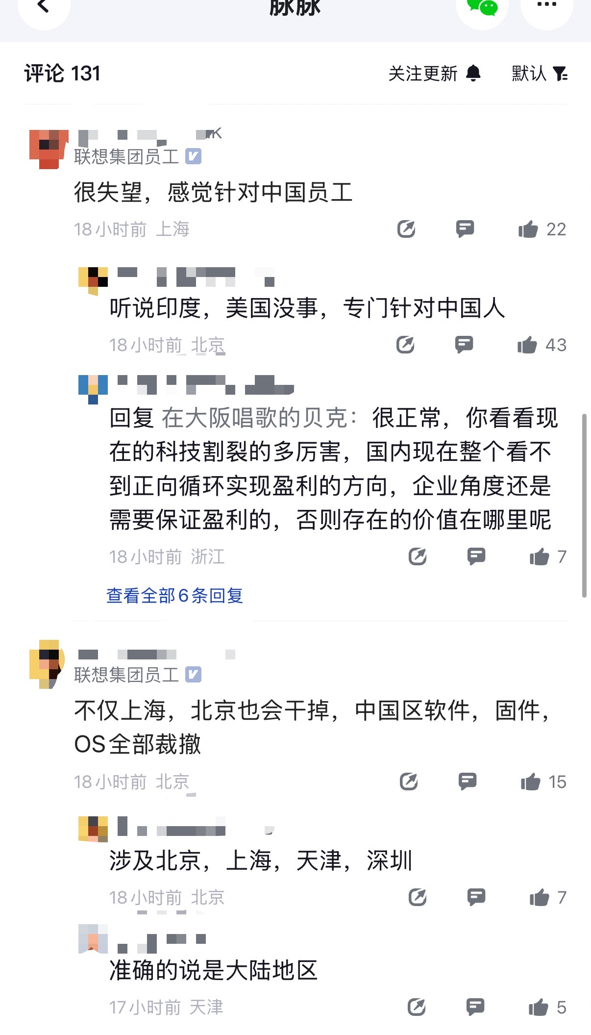 另有员工称,不仅上海,北京也会干掉,中国区软件,固件,OS全部裁撤,涉及北京、上海、天津和深圳等地。
