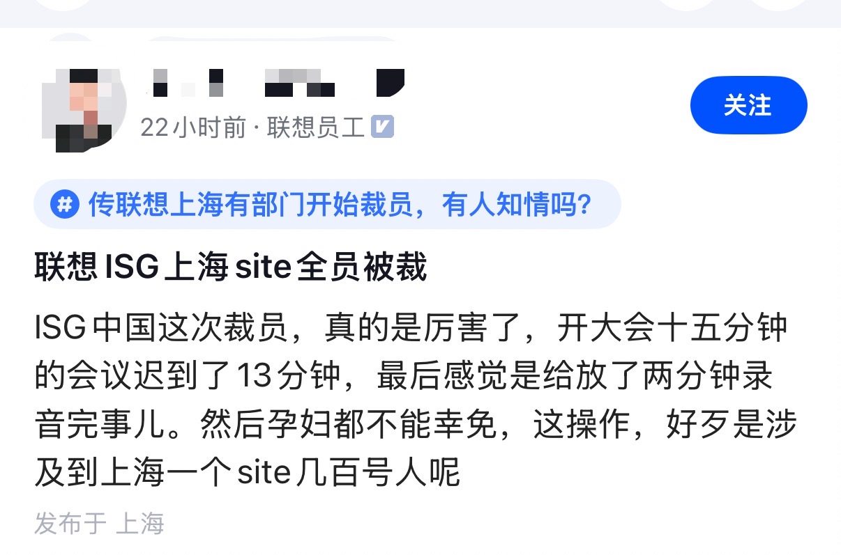 近日,据多名认证信息为联想员工的网友爆料,联想ISG上海全员被裁。该员工称,联想ISG中国此次裁员沟通会仅开了15分钟,且会议迟到了13分钟,播放了两分钟录音即宣布裁员事宜,孕妇都不能幸免。