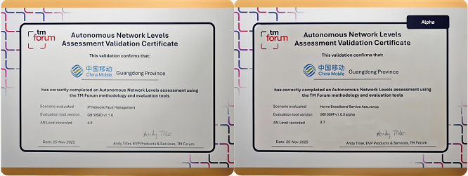 近日,在全球通信行业权威机构TM Forum(全球电信管理论坛)组织的自智网络(Autonomous Network, 简称“AN”)等级测评中,华为助力广东移动在IP网络故障场景和家宽业务保障场景通过了TM Forum 的 ANL(Autonomous Network Level,自智网络等级)测评和认证,达成当前业内最高等级,并获得TM Forum颁发的IP网络故障管理场景自智网络L4级认证。