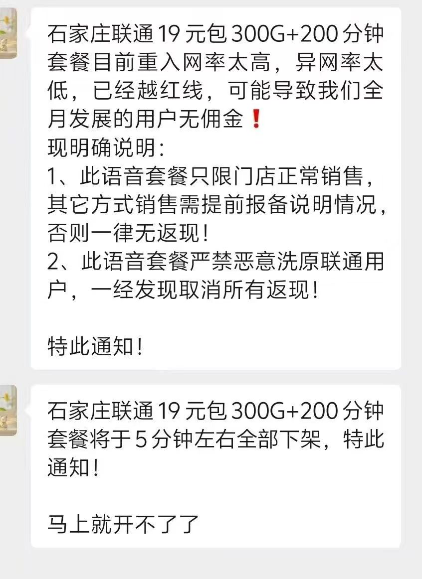 就在抢购高潮之际,一张通知截图开始流传:因“重入网率太高、异网率太低”,该套餐“已经越红线,可能导致全月发展用户无佣金”。通知强调:“该套餐只限门店正常销售,其他方式需提前报备,否则一律无返现;并严禁恶意洗原联通用户,一经发现取消所有返现。”同时宣布“套餐将于5分钟左右全部下架。”