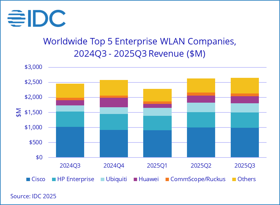 思科2025年第三季度企业级WLAN收入同比下降3.0%至9.924亿美元,占据37.4%市场份额。