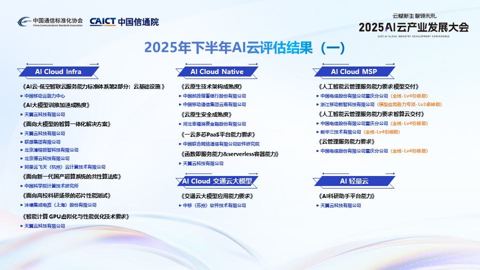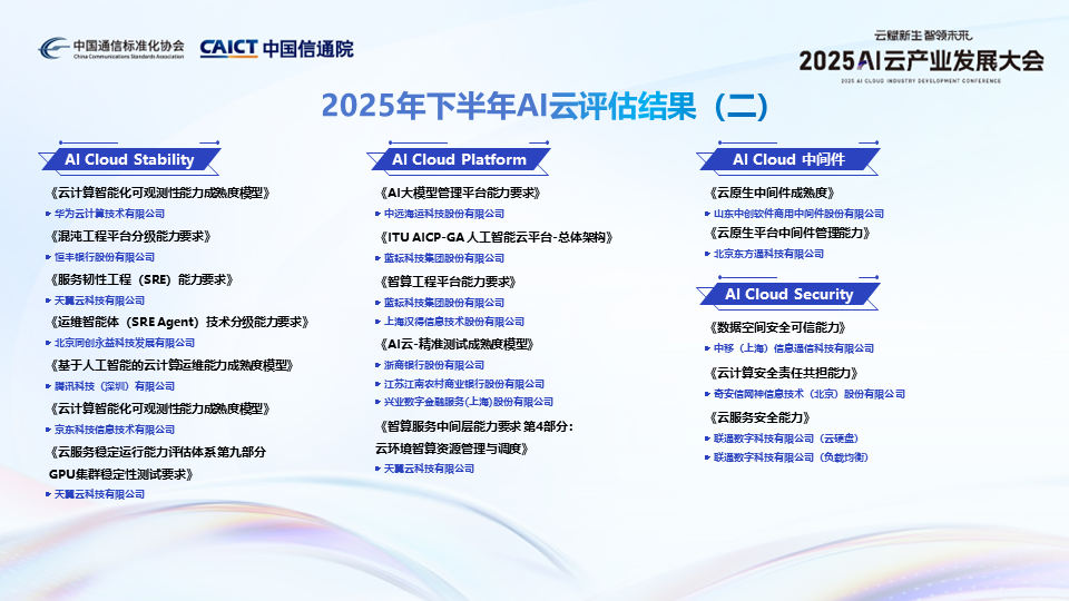 大会发布了2025年下半年AI云评估结果。中国信通院长期深耕云计算标准体系,在可信云的基础上,构建了可信AI云标准评估体系,包含了AI Cloud Infra、Platform、Native、MaaS、智能体服务、大模型工程化等评估方向,旨在为AI云产业生态建设的相关企业提供战略参考与服务商能力快速认知,营造高质量的AI云市场服务环境。