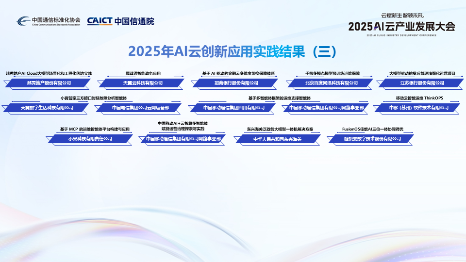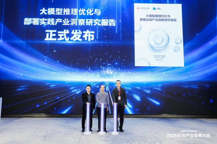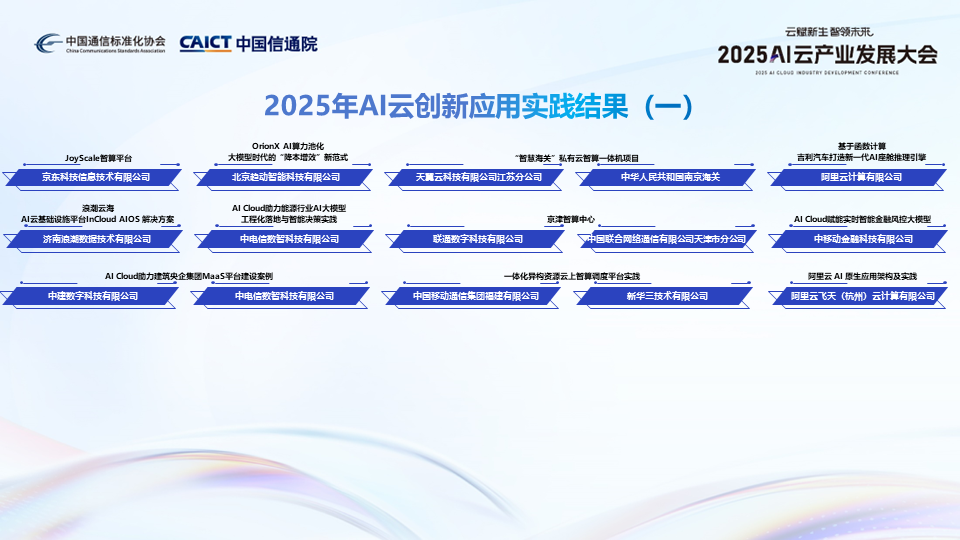 2025年12月12日,由中国通信标准化协会主办,中国信息通信研究院(以下简称“中国信通院”)承办的2025 AI云产业发展大会在北京成功召开。大会以“云赋新生 智领未来”为主题,发布了2025AI云十要素、《超大规模智算集群关键技术及工程落地研究报告》、《大模型推理优化与部署实践产业洞察研究报告》、《云端智能体:AI Agent技术与应用研究报告(2025年)》等,并公布了2025年AI云评估结果及创新应用实践。