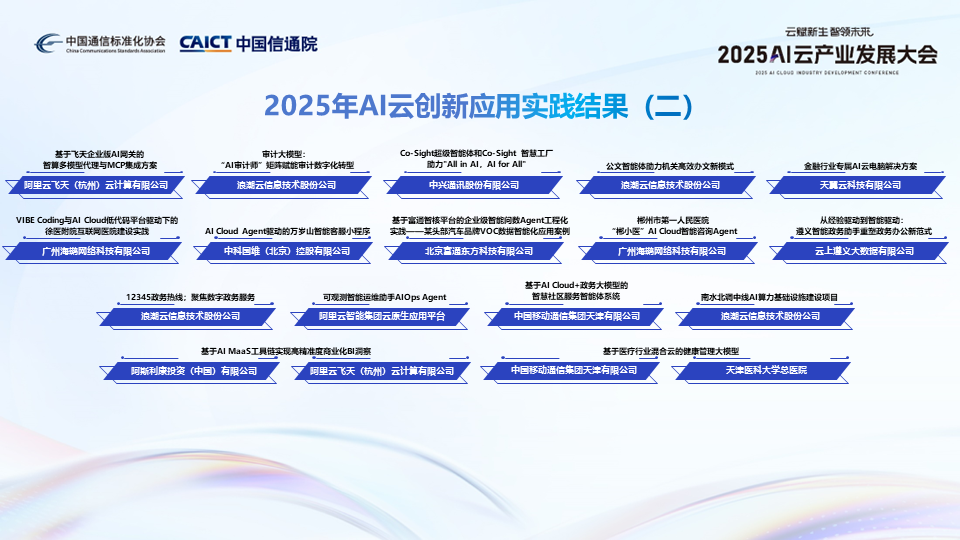 大会发布了2025年AI云创新应用实践结果。随着人工智能技术的飞速发展,智能算力需求逐渐取代通用算力成为算力结构的最主要构成。这一转变推动了云计算服务的升级,催生以人工智能为核心的新型云服务模式——AI云。为促进大模型工程化技术的创新发展,交流业内先进应用实践经验,推广工程化落地先进路径,云计算标准和开源推进委员会启动了“AI Cloud助力大模型场景化和工程化落地”活动。经多轮评审,共有 53 个创新应用实践脱颖而出。