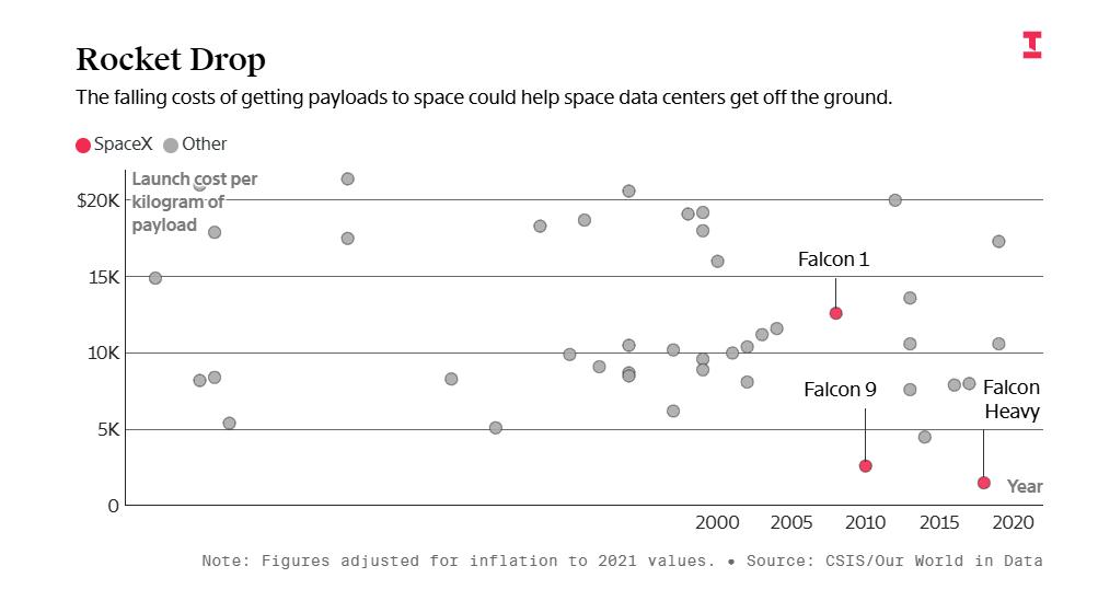 图:把有效载荷送入太空的成本不断下降,可能为太空数据中心的实现铺平道路