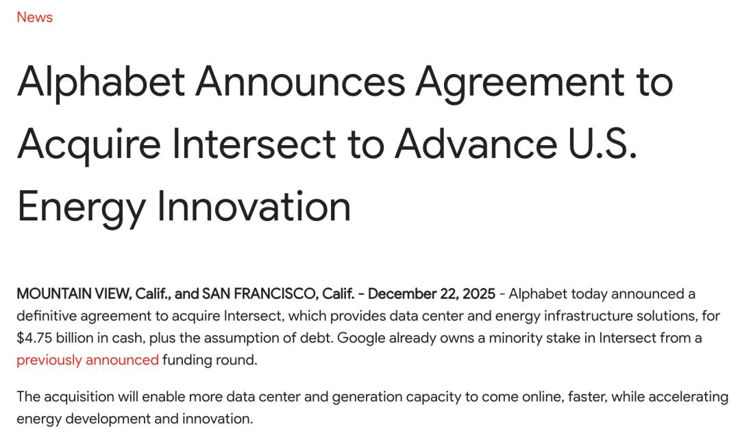 22日晚,谷歌母公司Alphabet官宣将以47.5亿美元(约合人民币333.85亿元)的现金收购美国数据中心和能源基础设施公司Intersect,并承担相关债务。本次收购计划于2026年上半年完成。