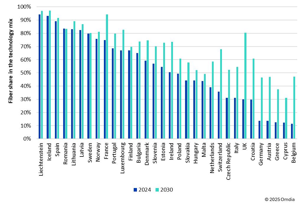 此外,根据Omdia的数据,在冰岛、西班牙和罗马尼亚等国,光纤在宽带技术组合中的占比超过80%。然而,德国、奥地利、希腊、塞浦路斯和比利时等市场的光纤渗透率报告低于15%,凸显了欧洲光纤采用进展的分化(见图1)。