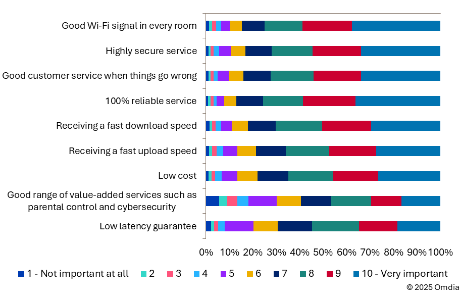 根据Omdia《2025年数字消费者洞察调查》,来自五个欧洲国家(法国、德国、意大利、西班牙和英国)的受访者将“每个房间都有良好的Wi-Fi信号”、“高安全性服务”、“出现问题时良好的客户服务”、“100%可靠的服务”、“获得高速下载速度”和“获得高速上传速度”列为他们认为宽带服务最重要的特性(见图2)。