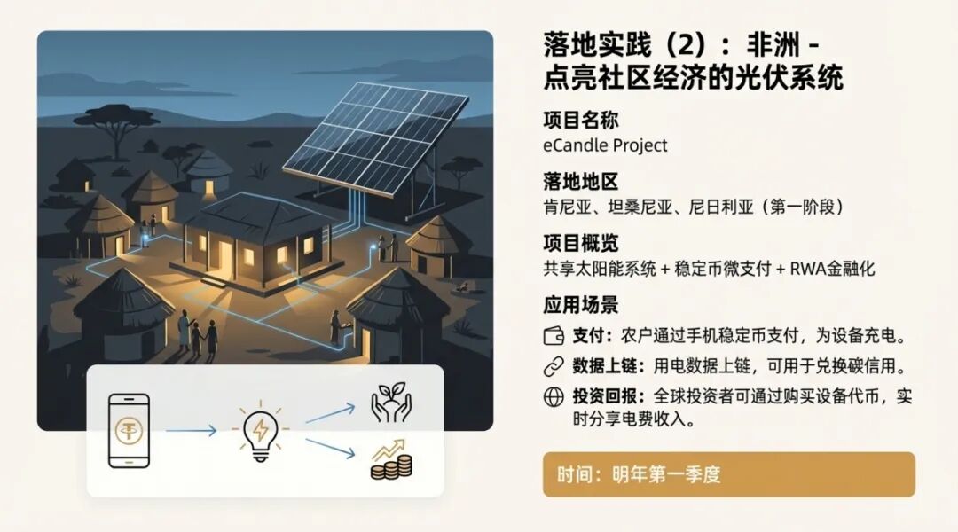 Leo在演讲中提到的非洲eCandle项目提供了一个极佳的案例。在缺乏电网覆盖的地区,一台价值500美元的太阳能板,在传统视角下只是一个固定的物理设备。但在机器经济的架构下,通过嵌入可信的结算模组,这台设备被转化为了一个实时的金融终端。它不再是一次性买卖的商品,而是被切割成了每秒钟的电力-资金流。