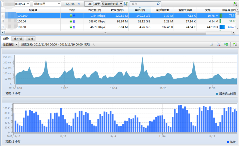 通过在该部门数据中心核心交换机部署xnSight进行全流量采集与长期监测,平台很快发现门户网站整体服务响应时间接近100ms,偏高。进一步针对HTTP会话进行深度分析,发现出国业务相关URL的响应时间异常突出,普遍达到数十秒,其中缴费查询与提交接口最为严重。