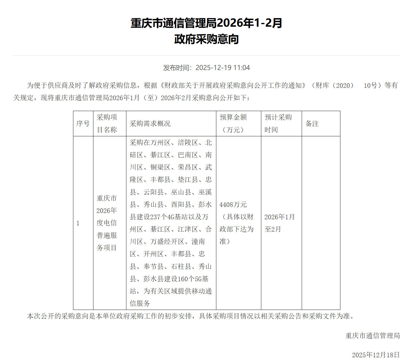 C114讯 12月26日消息(颜翊)根据重庆市通信管理局于2025年12月19日发布的政府采购意向,重庆市2026年度电信普遍服务项目计划于2026年1月至2月实施,共计将投入约4408万元。