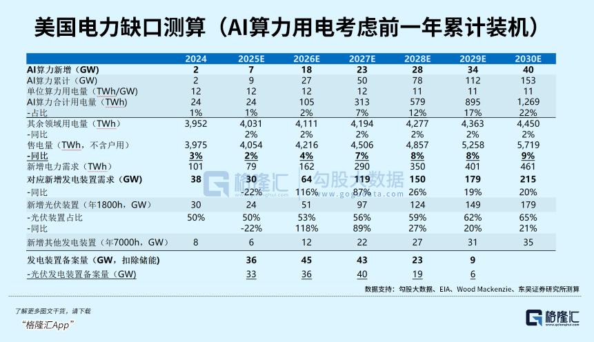 过去十年,美国年用电量基本稳定在4000TWh左右,复合增速仅2%。但AI数据中心的崛起彻底打破了这一平衡,算力扩张带来的电力需求呈指数级增长。按照保守测算,到2030年,美国累计AI算力将达153GW,对应电力需求约1269TWh,占总电力需求的22%。