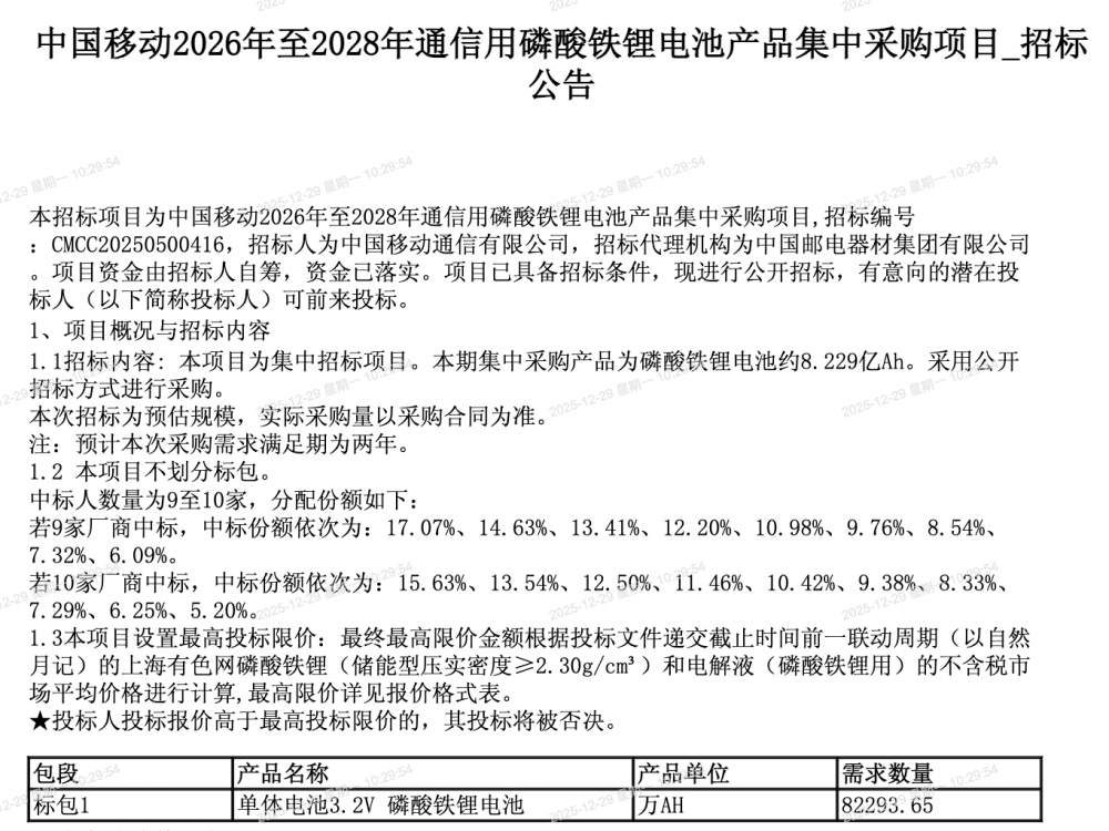 中国移动发布2026至2028年通信用磷酸铁锂电池产品集中采购招标公告,采购量约8.229亿Ah,预计满足期两年,不划分标包,中标人9至10家,并设置最高投标限价。