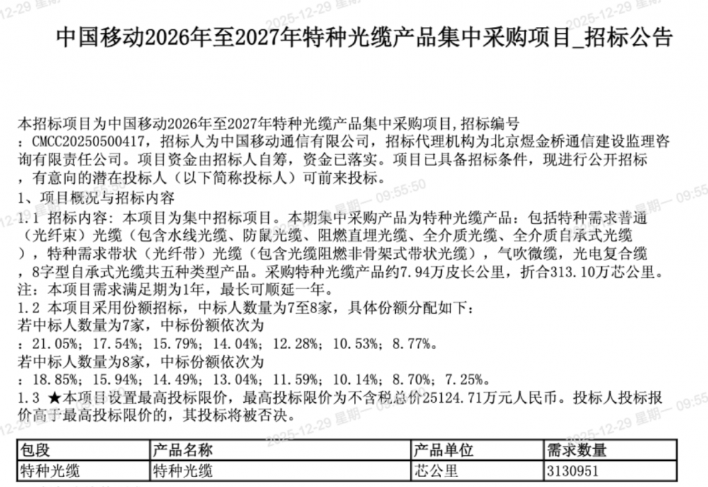 C114讯 12月29日消息(九九)中国移动采购与招标网日前发布2026年至2027年特种光缆产品集中采购项目招标公告,集中采购特种光缆产品:包括特种需求普通(光纤束)光缆(包含水线光缆、防鼠光缆、阻燃直埋光缆、全介质光缆、全介质自承式光缆),特种需求带状(光纤带)光缆(包含光缆阻燃非骨架式带状光缆),气吹微缆,光电复合缆,8字型自承式光缆共五种类型产品。采购特种光缆产品约7.94万皮长公里,折合313.10万芯公里。