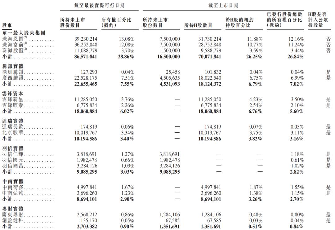 上市后,腾讯持股7.02%,云锋基金实体持股5.6%,通瑞实体持股为3.16%,羽信实体持股为2.82%,中南实体持股为2.7%,Accel Asia Holdings II持股为5.88%,湖北高质量持股为4.77%,Madison Square持股为4.22%,大湾区基金旗下GBA Fund持股为4.22%,天津魏紫持股为4.19%,金科灼智持股为4.47%。