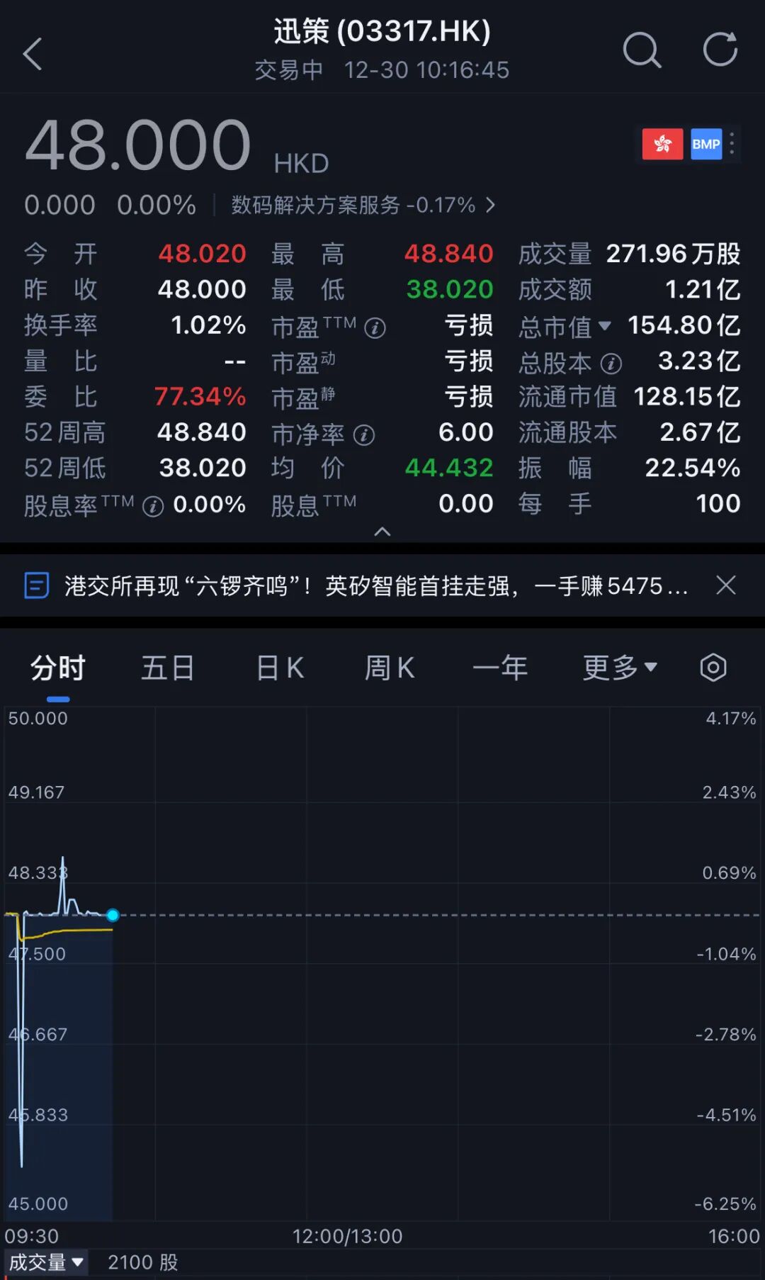迅策科技截至12月30日10:15股价图(图源:腾讯自选股)