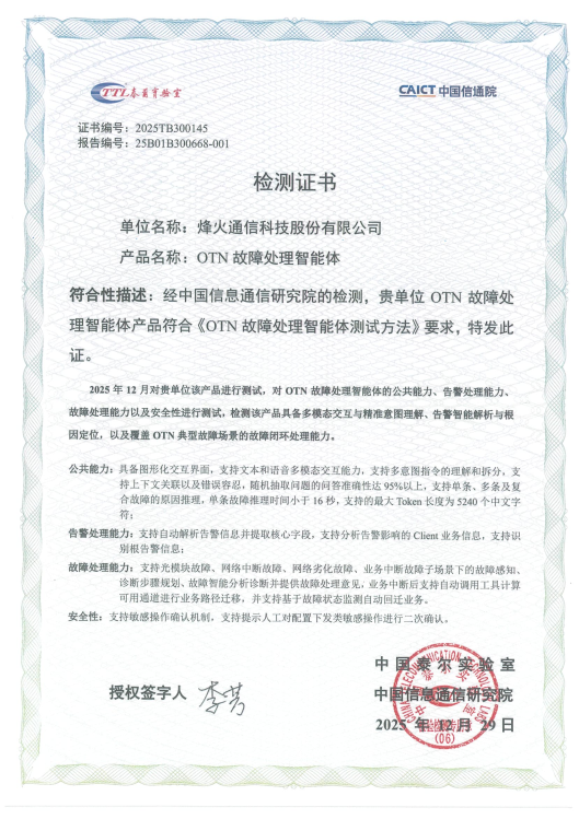近日,烽火通信OTN故障处理智能体率先通过中国信息通信研究院泰尔实验室专业测试认证,这是国内传送网领域故障智能体技术首个专业化权威认证。同期,辽宁移动携手烽火通信成功完成故障智能体现网工程试点,标志着烽火通信故障智能技术已具备专业化、标准化应用能力,管控系统智能化运维能力正式迈入L4级别。