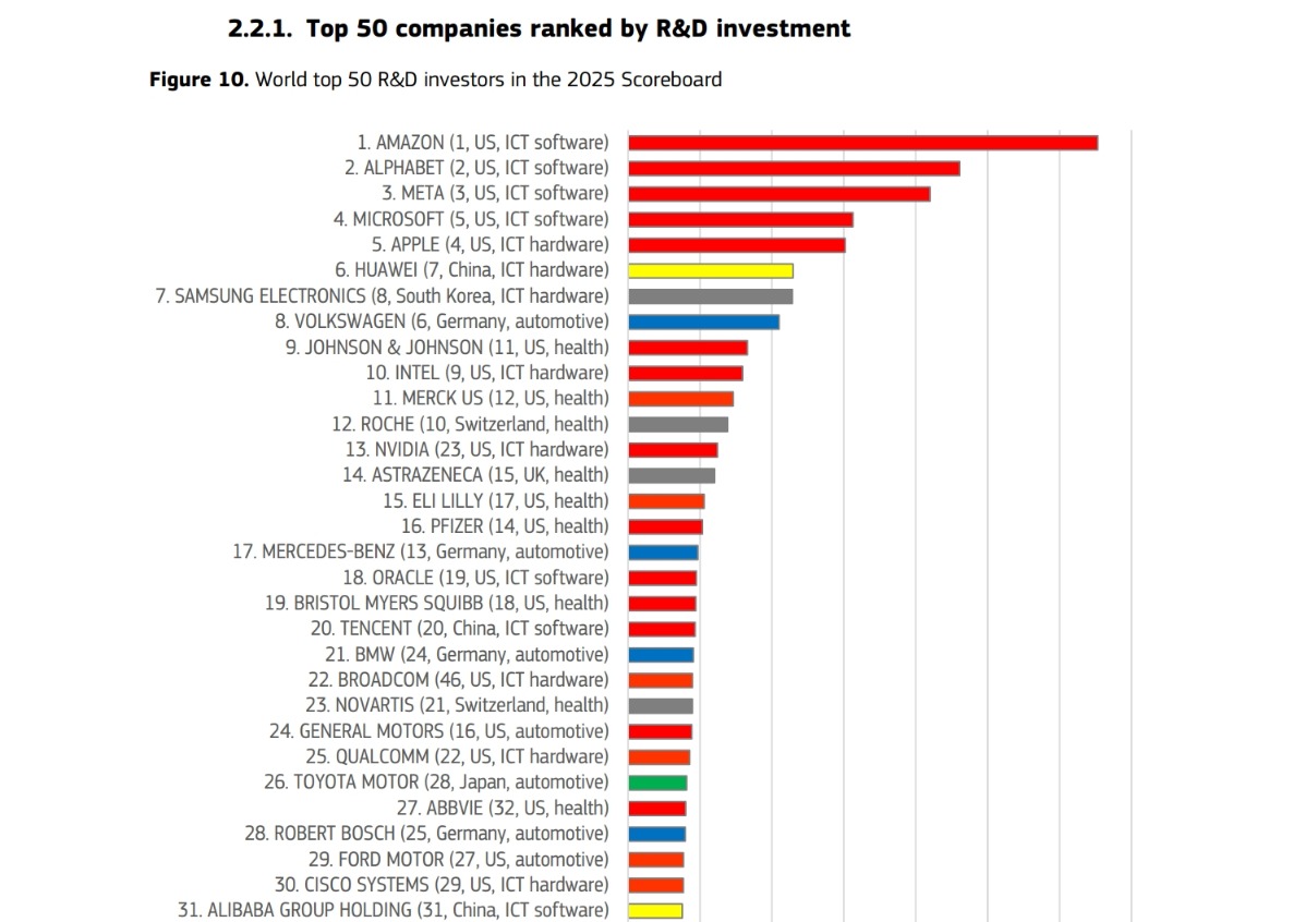 韩国方面,在企业研发投入排名中,三星电子位列全球第七。三星扩大了在半导体、人工智能芯片和先进工艺领域的投资规模,其表现优于英伟达(第十三)、博通(第二十二)和台积电(第四十一)。在韩国国内企业中,SK海力士(第七十四)、现代汽车(第七十八)和LG电子(第九十六)跻身前一百强。(校对/赵月)