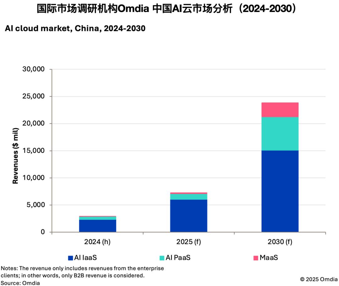 国际市场调研机构Omdia 2025年9月数据显示,2024年中国AI云市场规模约29亿美元,其中AI IaaS(基础设施)23亿美元,占比79%;AI PaaS(平台软件)5.6亿美元,占比24%;AI MaaS收入规模0.3亿美元,占比1%。