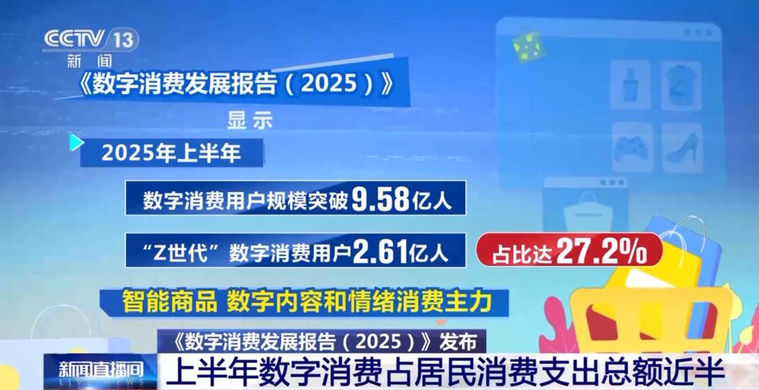 根据近期发布的《数字消费发展报告(2025)》报告显示,我国数字消费用户规模突破9.58亿。其中,“Z世代”数字消费用户2.61亿人,占比达27.2%,是智能商品、数字内容和情绪消费主力。2025年上半年,数字消费总额达9.37万亿元,占居民消费支出总额近一半。