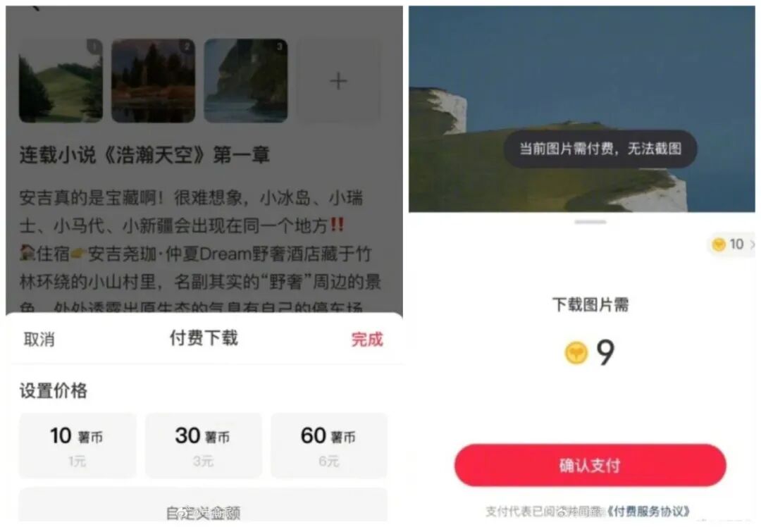 其二,是针对知识类创作者的长文付费解锁。小红书针对长文作者、故事创作者,推出“试读+付费解锁”模式,即创作者可以自行设置一个免费试读的模式。比如前30%,后续用户需要支付比如1-10元来解锁全文。另外小红书要求,使用长文功能发布,笔记图片数>=3。这种模式我们并不陌生,与知乎盐选、微信公众号付费阅读类似。