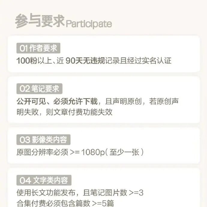 小红书客服工作人员表示,笔记付费功能目前为平台邀约制。根据受到邀约的用户信息,我们发现,发布付费笔记的创作者,仅需要粉丝数在100人以上,且近90天无违规记录,完成实名认证。另外在付费笔记的设置上,10页内容最少需设置2页试读,后面页数内容可收费,价格为1-199元不等。