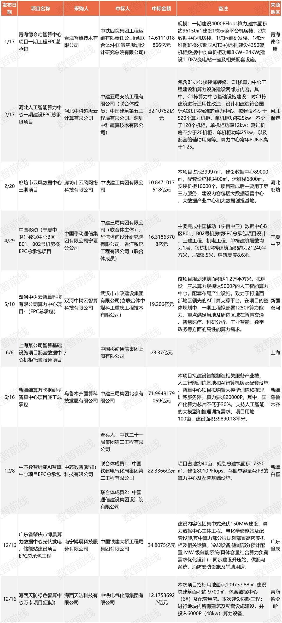 这样的背景下,据数智前线不完全统计,2025年招投标市场上,至少涌现出了222个亿元以上的数据中心相关项目。其招标内容涉及大量EPC总承包项目,以及变电站、冷源、软硬件等分项项目的采购。