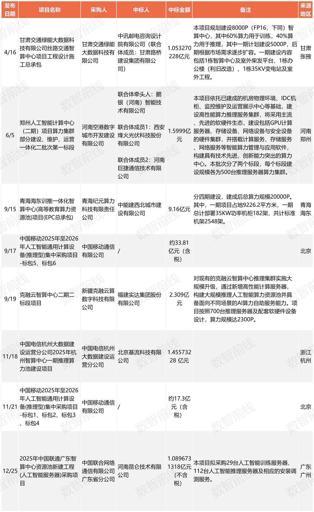需求变化快速传导至供给端,推理算力不再只是训练配套,更成为数据中心建设核心布局方向,不少项目均把“推理”纳入官方规划与设备配比。数智前线统计的超200个亿元级大单中,至少有12个项目在招标文件中明确提及推理集群建设。