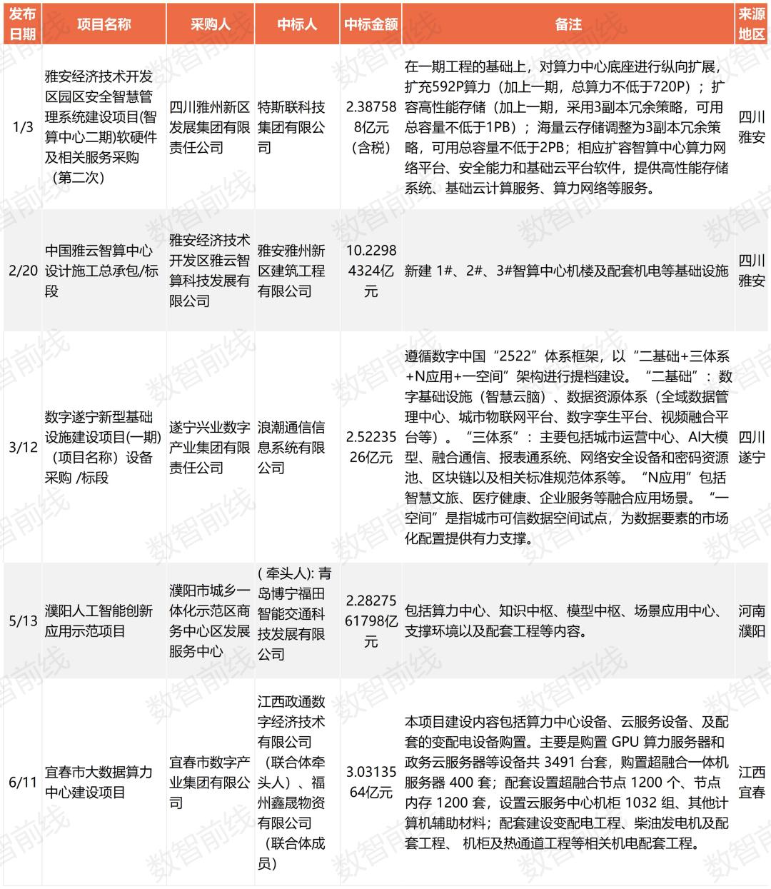 具体来看,政府主导建设或政企合作型的项目,依然不少。如雅安经济技术开发区园区安全智慧管理系统建设项目(智算中心二期)软硬件及相关服务采购(2.39亿元),数字遂宁新型基础设施建设项目(一期)设备采购(2.52亿元)等。