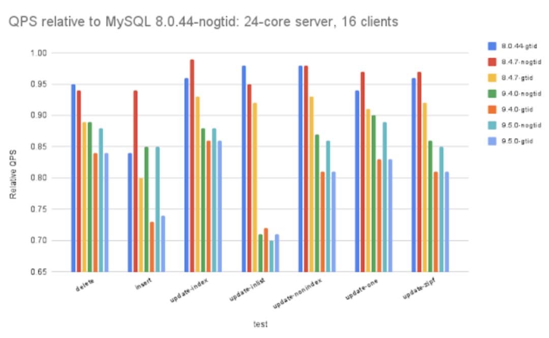 此外,还有大量用户反馈,在更新到较新的 MySQL 版本后性能出现下降。例如,知名 MySQL 性能专家 Mark Callaghan 的基准测试显示,在写密集型工作负载下,MySQL 9.5 的吞吐量通常比 8.0 低约 15%。