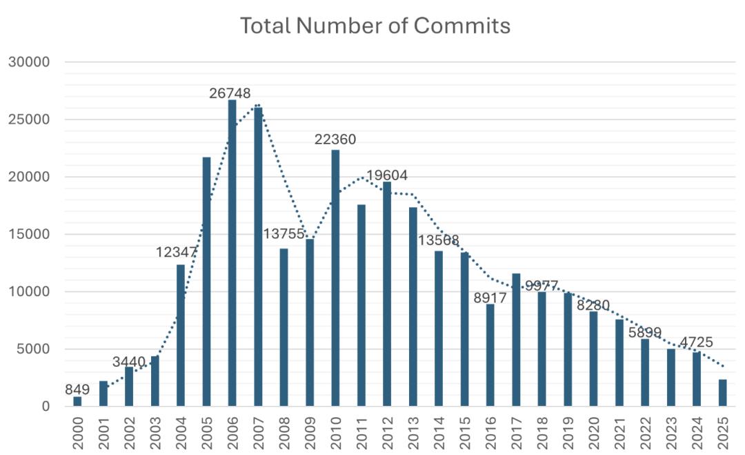 根据 Percona 软件工程经理 Julia Vural 绘制的图表显示,2025 年 MySQL 的总提交量降至项目启动(2000-2001 年)以来的最低值,远低于 2019 年之前的水平。