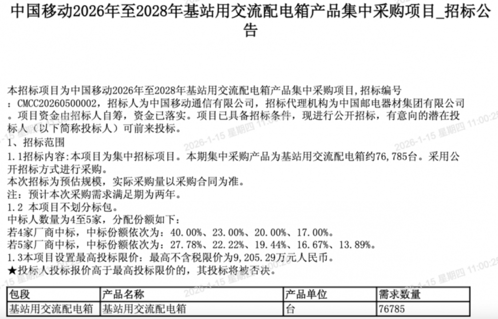 C114讯 1月15日消息(九九)中国移动采购与招标网日前发布2026年至2028年基站用交流配电箱产品集中采购项目招标公告,集中采购产品为基站用交流配电箱约76785台。预计本次采购需求满足期为两年。