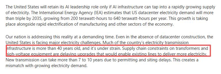 微软在报告中承认:美国大部分输电线路运行超过40年,早就超负荷运行,变压器等关键设备全球缺货,供应链被卡死。