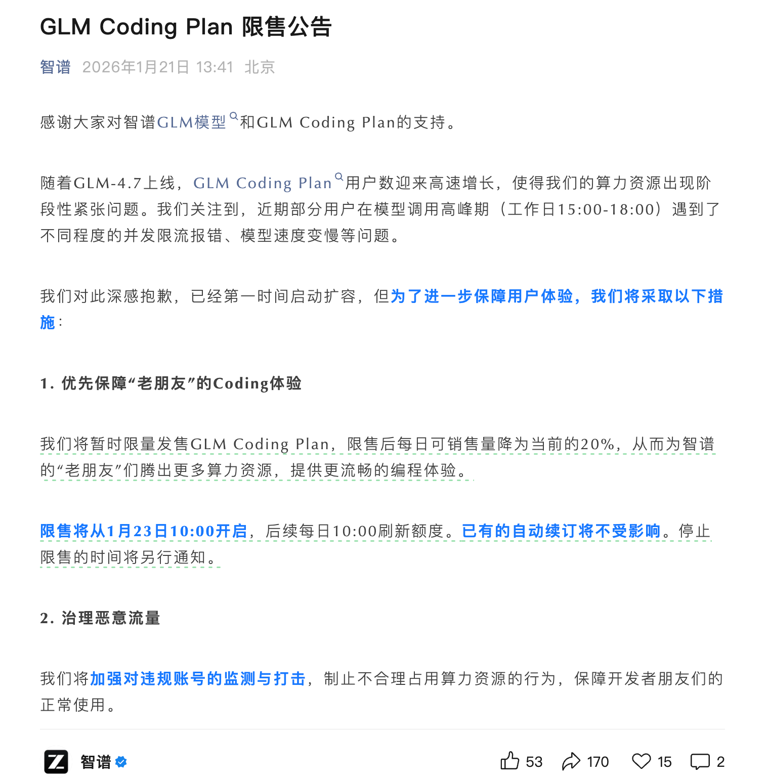 凤凰网科技讯 1月21日,智谱发布GLM Coding Plan限售公告称,随着GLM-4.7上线,GLM Coding Plan用户数迎来高速增长,使得我们的算力资源出现阶段性紧张问题。我们关注到,近期部分用户在模型调用高峰期(工作日15:00-18:00)遇到了不同程度的并发限流报错、模型速度变慢等问题。智谱将暂时限量发售GLM Coding Plan,限售后每日可销售量降为当前的20%,从而为智谱的“老朋友”们腾出更多算力资源,提供更流畅的编程体验。限售将从1月23日10:00开启,后续每日10:00刷新额度。已有的自动续订将不受影响。停止限售的时间将另行通知。