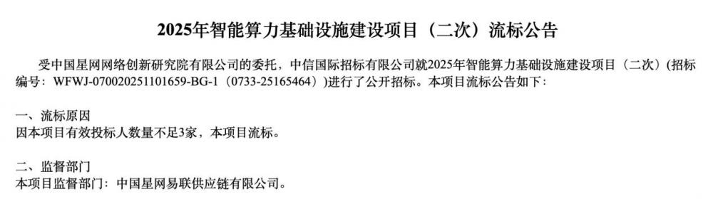 时隔一个多月,2026年1月21日,中国星网发布2025年智能算力基础设施建设项目(二次)流标公告,原因是“本项目有效投标人数量不足3家”。