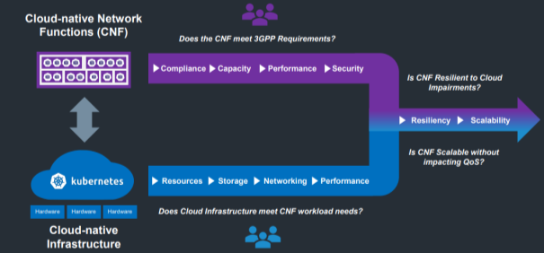 云原生网络功能(CNF)必须满足3GPP规范要求的安全、弹性及性能标准,并达到与基于专用设备的网络功能同等的水平。与传统设备不同,云原生部署涉及多供应商系统,其中CNF、容器即服务(CaaS)以及云基础设施由不同供应商提供。在垂直解决方案中,网络功能供应商负责评估应用(CNF、虚拟网络功能/VNF)的性能与可靠性。这在多供应商系统中很难实现。