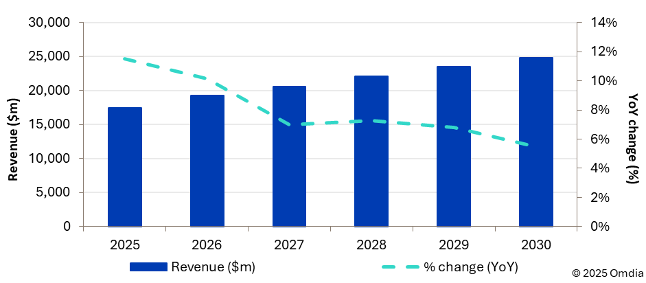 Omdia预测,电信网络云市场将从2025年的174亿美元增长至2030年的248亿美元,复合年增长率为7.3%。如图1所示,Omdia预计在整个预测期内将保持中高个位数的增长。