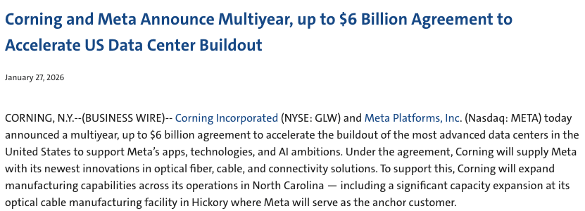 公告中写道,根据协议,康宁将向Meta供应其最新的光纤、电缆及互联解决方案。为支持此项合作,康宁也将对其北卡罗来纳州工厂进行“重大产能扩张”,Meta将成为该厂的主要客户。