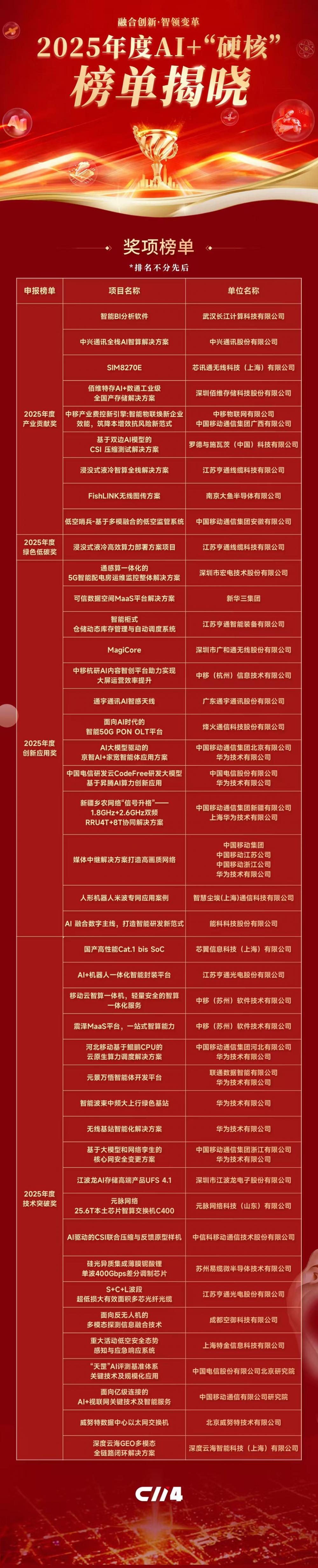 1月30日,由C114通信网主办的“2025年度AI+‘硬核’榜单征集活动”正式放榜。在“产业贡献”“技术突破”“创新应用”“绿色低碳”四大赛道中,共有来自科研机构、运营商、设备厂商及产业链创新企业的42项成果脱颖而出,涵盖AI Infra、AI Agent、具身智能、低空经济、自智网络、5G-A创新应用等前沿领域,全面呈现中国信息通信业以人工智能为核心驱动力的新一轮高质量发展图景。