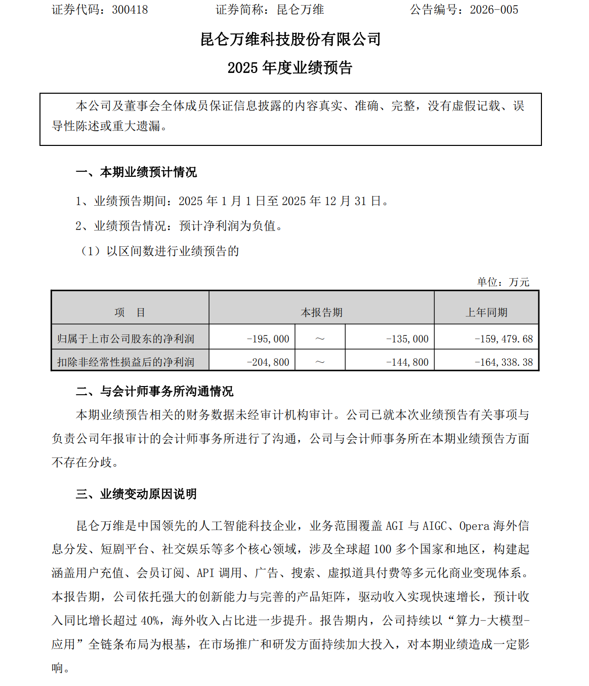 凤凰网科技讯 1月30日,昆仑万维公告称,预计2025年净亏损13.5亿元-19.5亿元,上年同期亏损15.9亿元。