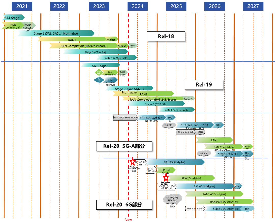 小枣君综合了一下 3GPP R18/R19/R20 的时间表信息,画了一张图: