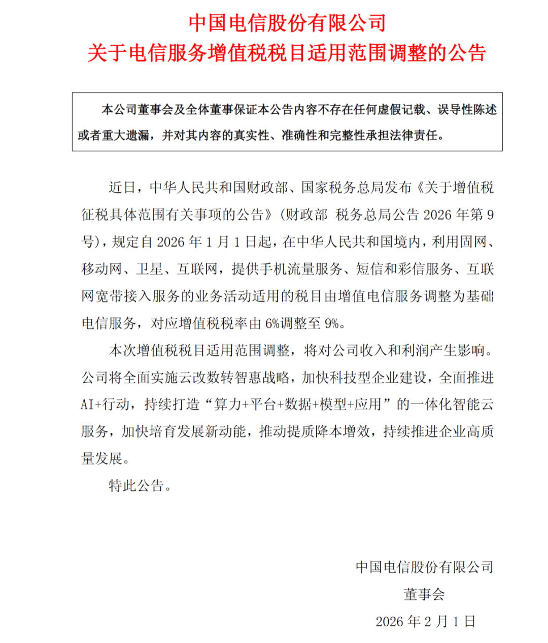 中国电信公告称,近日,中华人民共和国财政部、国家税务总局发布《关于增值税征税具体范围有关事项的公告》(财政部税务总局公告2026年第9号),规定自2026年1月1日起,在中华人民共和国境内,利用固网、移动网、卫星、互联网,提供手机流量服务、短信和彩信服务、互联网宽带接入服务的业务活动适用的税目由增值电信服务调整为基础电信服务,对应增值税税率由6%调整至9%。本次增值税税目适用范围调整,将对公司收入和利润产生影响。