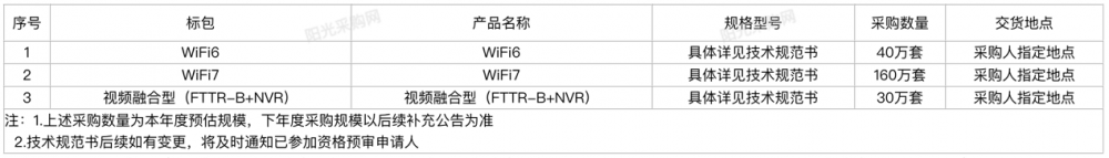 公告显示,本次集采共三个标包,其中Wi-Fi6产品40万套,Wi-Fi7产品160万套,视频融合型(FTTR-B+NVR)产品30万套。