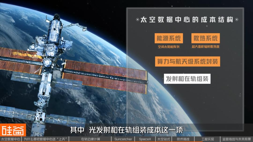 目前太空数据中心的成本结构主要包括四个部分:能源系统(空间太阳能阵列)、散热系统(超大面积辐射散热器)、算力与航天级系统封装、以及发射和在轨组装。