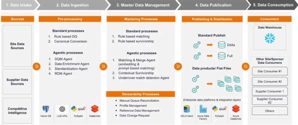 在前几节中,我们探讨了Gen AI赋能的具体功能及其在主数据管理(MDM)中的应用方式。这些方法本身就能带来价值。在本节中,我们将了解如何将这些功能连接起来,并在整个MDM流程中端到端地应用,从而实现相互促进,发挥最大的整体效益。