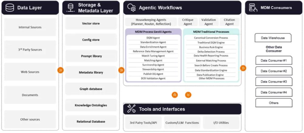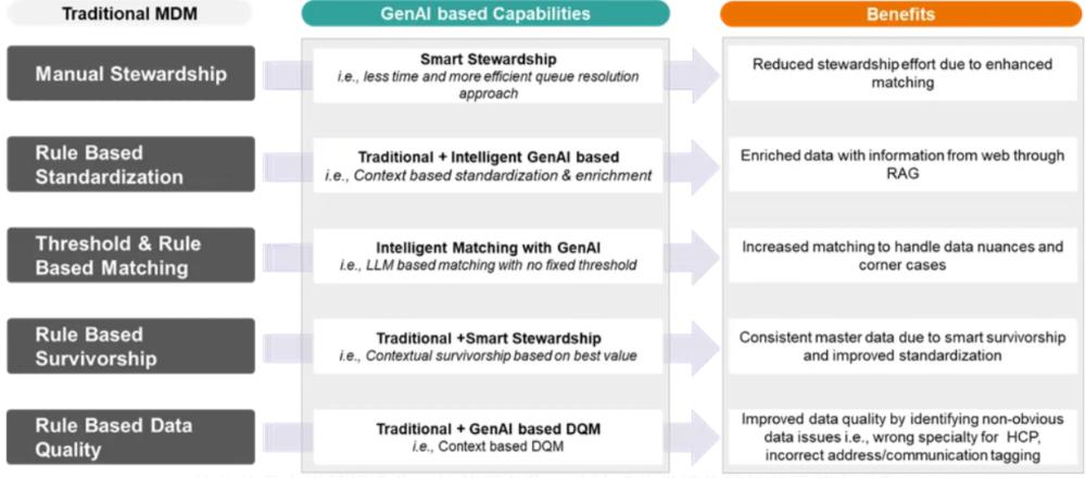 关键在于,Gen AI并非与MDM并行运行的独立系统,而是一个附加层,旨在改进MDM的日常运作,使流程更快、更具可扩展性且更易于操作,同时又不改变MDM本身的基本原理。
