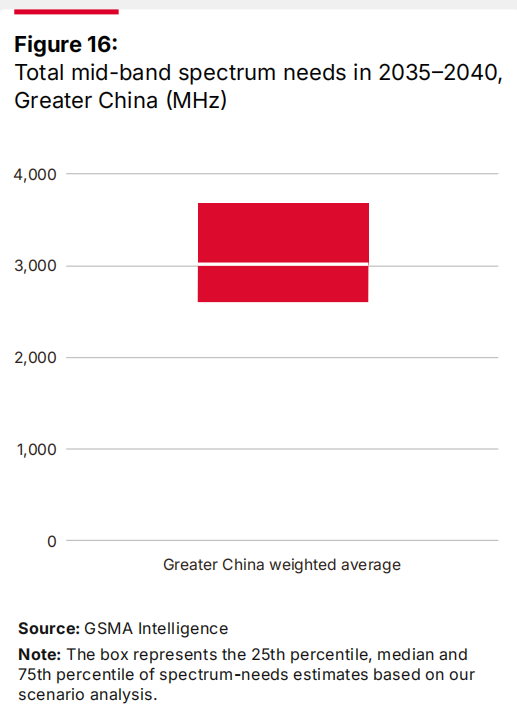 GSMA预测显示,在2035年至2040年期间,中国对中频段频谱的需求为2.6-3.7 GHz。