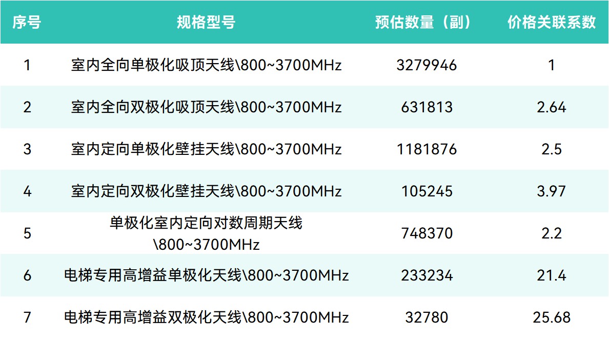 招标设置最高限价:基准型号“室内全向单极化吸顶天线”不含税单价不高于6.67元/副,其余型号按价格关联系数折算。其中,电梯专用高增益双极化天线关联系数高达25.68,对应限价约171元/副。