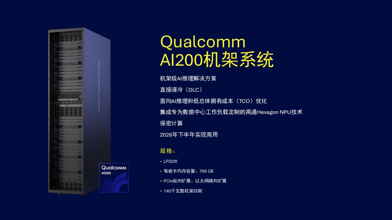 一个最核心的部分将是Qualcomm AI200机架系统——将加速卡、内存架构、互连技术和管理软件整合至统一的、可部署的系统。这一机架级解决方案体现出客户对AI基础设施的评估方式正日益转变——不再将其视为孤立的组件,而是面向持续运行而设计的完整可维护系统。Qualcomm AI200机架系统提供了突破性的43 TB内存容量,使其成为运行最新、最大旗舰AI模型推理的理想选择。Qualcomm AI200机架系统将于今年开始部署,展示了高通技术公司如何解决计算和连接瓶颈——不仅在边缘侧,如今更是深入数据中心的核心层面。